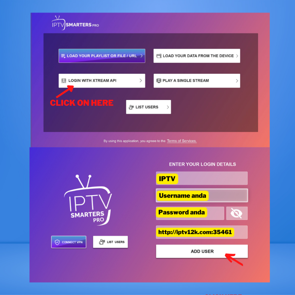 🔹 Masukkan ID, Password & URL (Xtream Codes API)